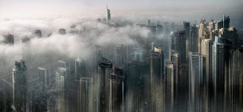2005 zog die Künstlerin nach Dubai, einem der sieben Emirate der Vereinigten Arabischen Emirate, und lebte dort 12 Jahre. Aus diesem Grund hat sie unzählige Bilder dieses fantastischen Ortes geschaffen, der sich in dieser Zeit rasant weiterentwickelt und verändert hat. Ein überwältigendes Erlebnis war jedes Jahr die Nebelsaison. Dank einer wunderbaren Fotografen-Community bekam sie die Chance, den Cayan Tower und den Princess Tower in der Dubai Marina zu betreten, um dieses Spektakel über den Wolken zu erleben und zu fotografieren.